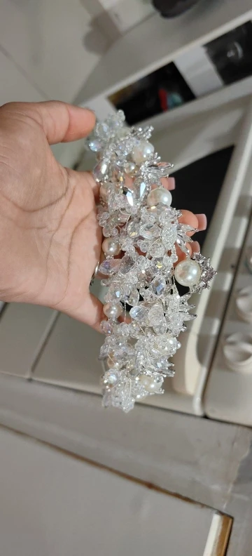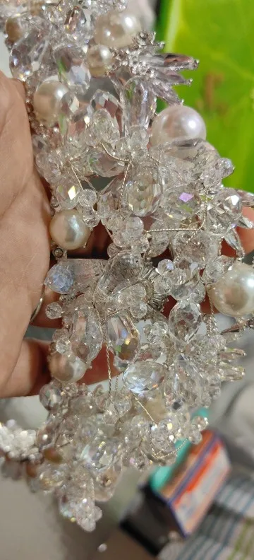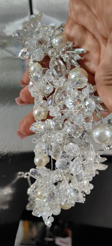 这款奢华的新娘皇冠展示了迷人的设计,融合了闪闪发光的水晶、有光泽的珍珠和复杂的花卉图案。表冠经过精心制作,将反射光线的刻面水晶装饰与优雅的珍珠装饰完美融合,增添了一丝永恒的精致感。精致的金属丝细节营造出异想天开的轻盈效果,小水晶和珍珠芽向外延伸,模仿盛开的花朵。这款皇冠非常适合寻求富丽堂皇和童话风格配饰的新娘,散发着优雅和魅力,使其成为新娘造型的惊人中心。